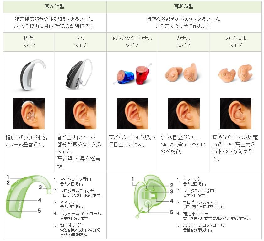 補聴器にはいくつかの種類があり、聞こえ具合や装用時間、ご予算などいくつかの条件を合わせたうえで、お好みのものをお選びいただけます。 もちろん、補聴器の検討や購入のご相談は、補聴器販売店の経験豊かな専門ス タッフがうかがうのですが、その前に、どんな補聴器があるのか知っていると希望を伝えやすくなるかもしれません。どんな補聴器があるのか、一度ご確認ください。
