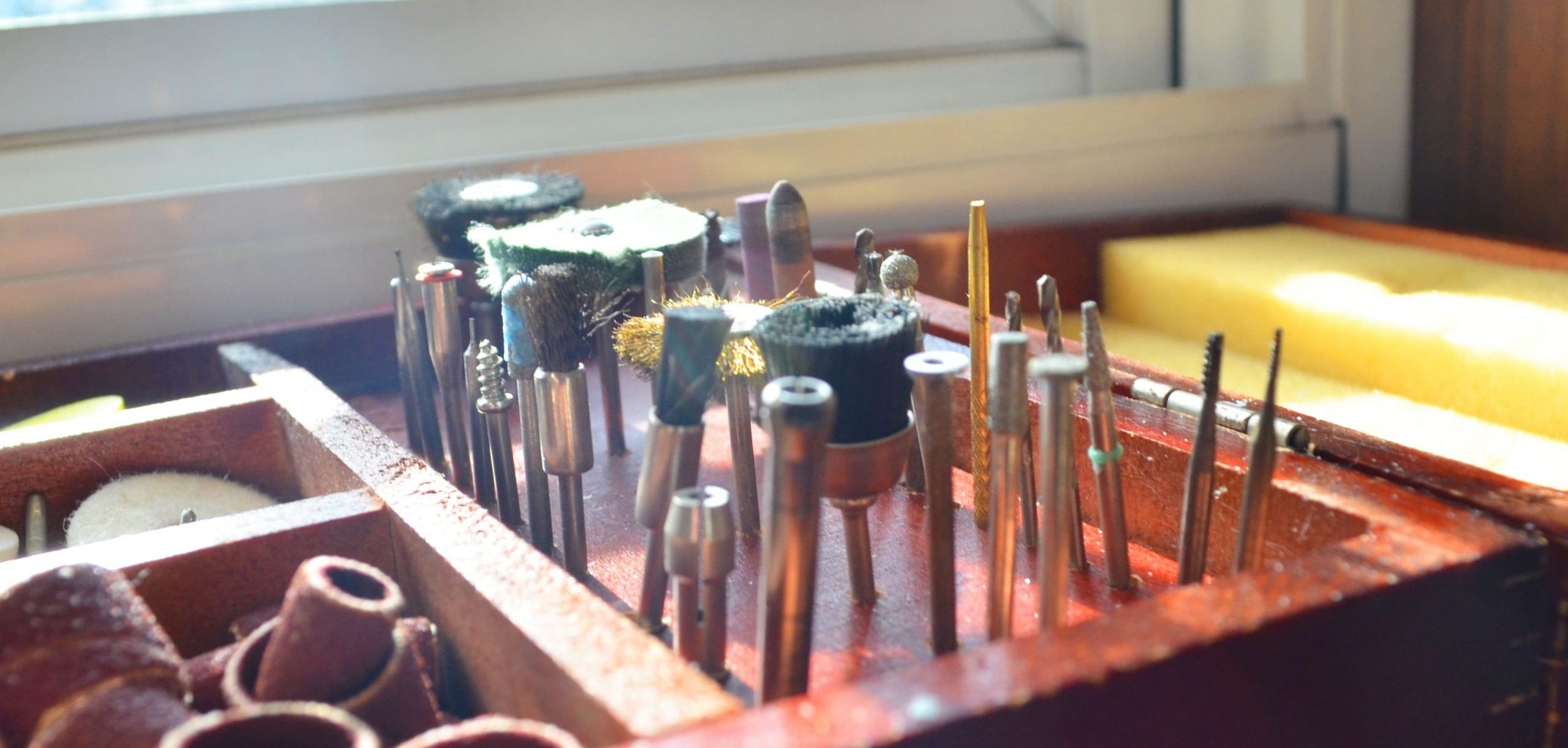 工房では削るヤスリに加え、表面を滑らかにするペーパーヤスリ、ダイヤモンドの粒子が先端に付いているドリルなど、様々な工具が置かれています。いつでもお客様のご要望にお応えできるよう現場スタッフがヒアリングを行い、加工を施します。第三者に作製・メンテナンスを依頼しないのでご希望通りの指輪が仕上がると自負しております。加工現場を実際に見ていただくのも思い出になるかもしれません。
